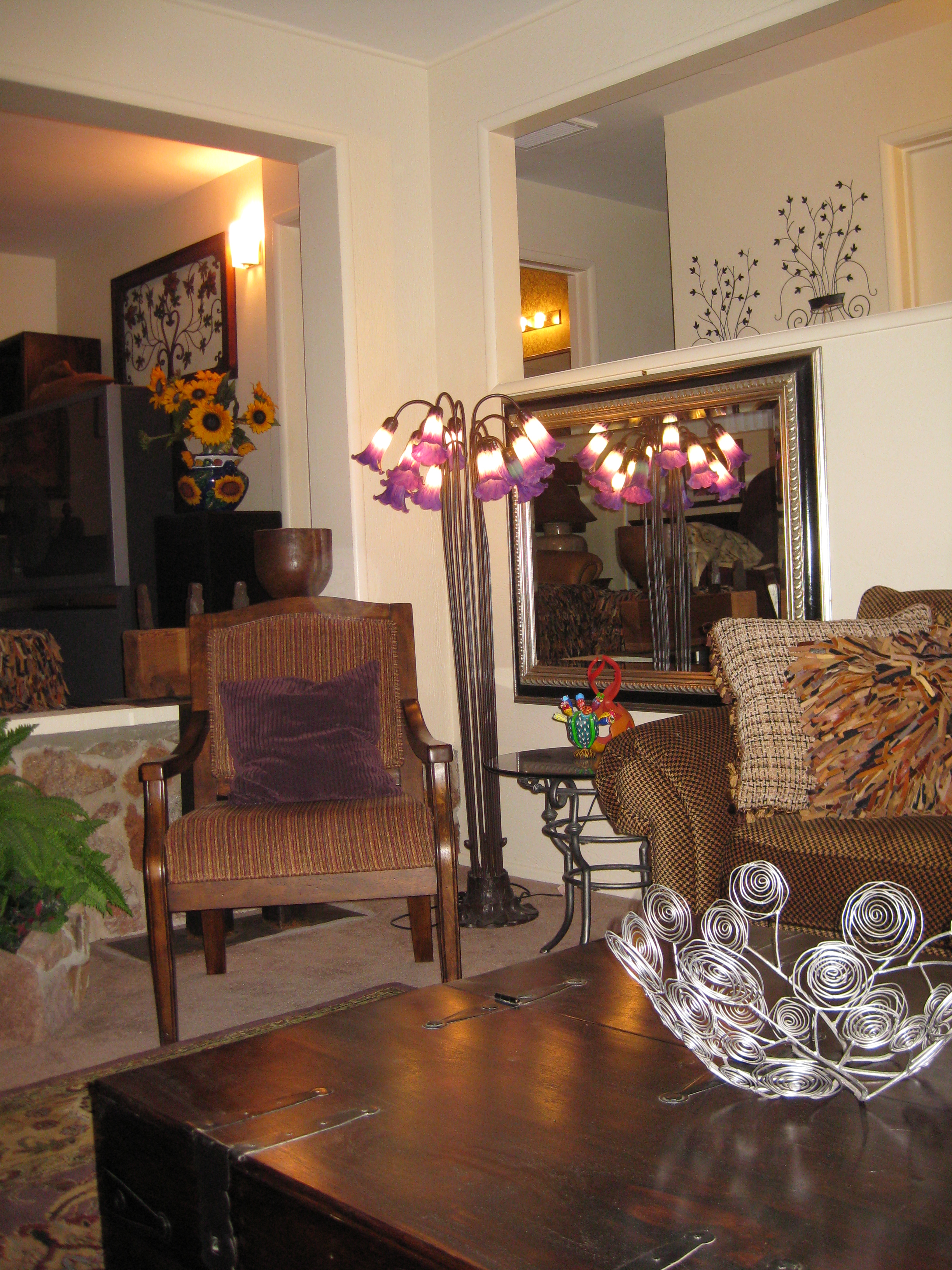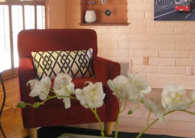 living room home staging red chair flower image